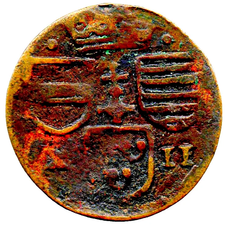 Crown above shields of Bouillon, Looz, and Hornes, with Liège's perron between them; the bottom shield divides the Roman numeral value.