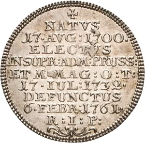 NATVS // 17. AVG: 1700. // ELECTVS // IN SUPR: ADM: PRUSS. // ET M: MAG: O: T: // 17. IUL: 1732. // DEFUNCTUS // 6. FEBR: 1761. // R: I: P: