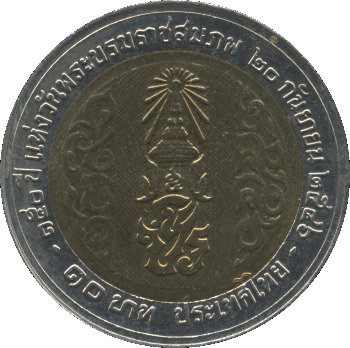 King Chulalongkorn’s cypher under the Great Crown of Victory, with a Thai "5" between them. Flanking the design are the artist’s numerals "2396" (left) and "2546" (right).