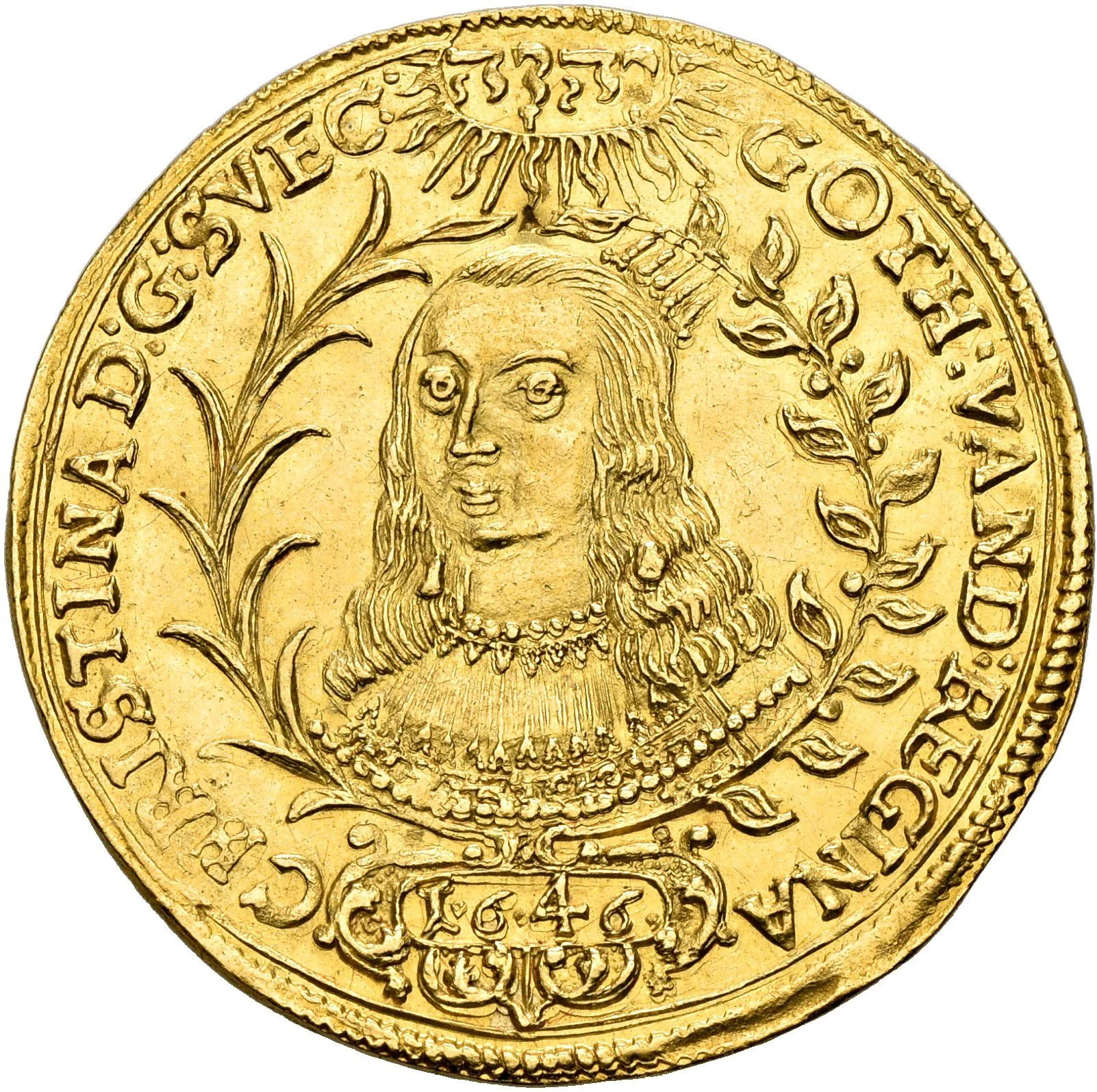 Description: Bust of Queen Christina of Sweden facing left, wearing a coronet and ruff. Flanked by a palm wreath and laurel branch. A radiant sun with God's name in Hebrew above, and the date in a cartouche below.