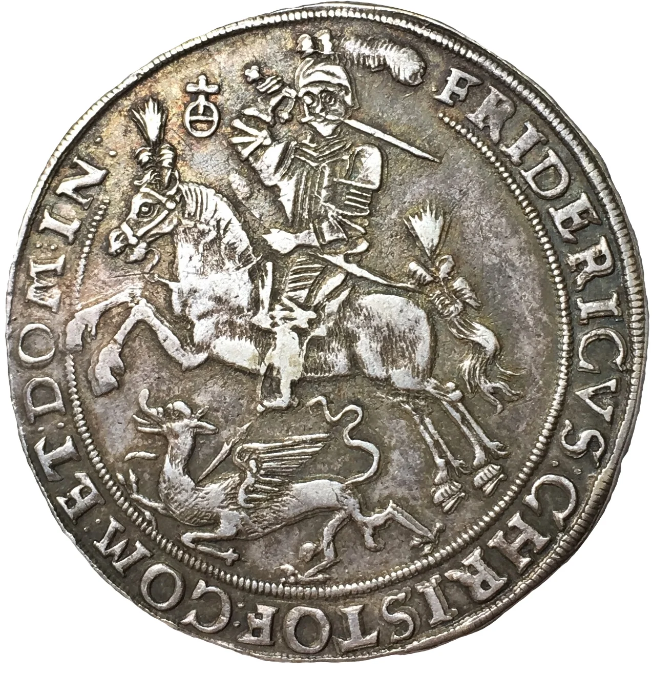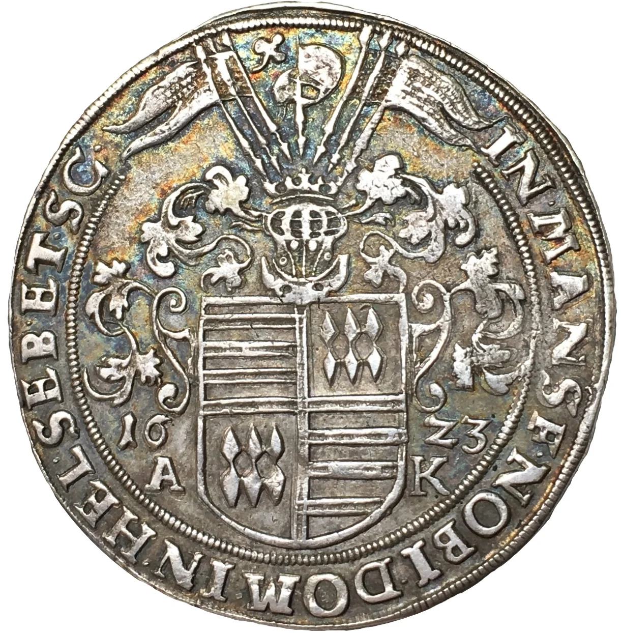 Shielded arms flanked by helmet, date, and mintmaster initials.