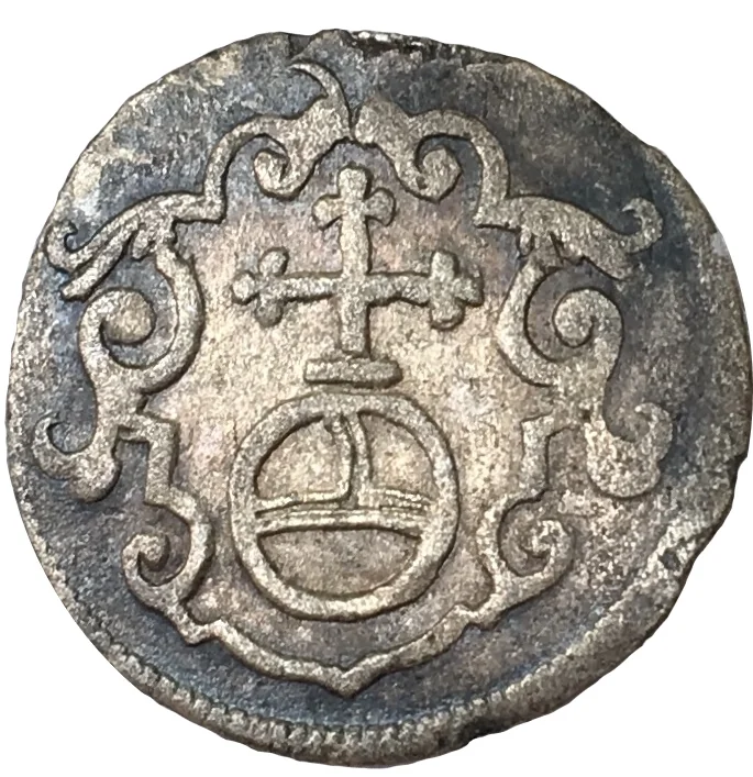 Three ornate shields, one over two, date on upper arms, mintmaster's initials below.