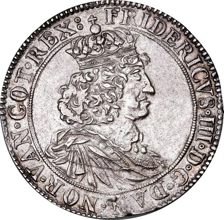 Right-facing bust of Frederik III in crown and mantle within a rope circle, broken only by the crown's cross. Legend surrounds.