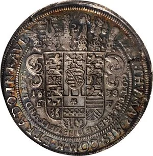 Description: Shield with central ducal Saxony arms divides date and mintmaster initials; six ornate helmets above, inner inscription within partial beaded circle.