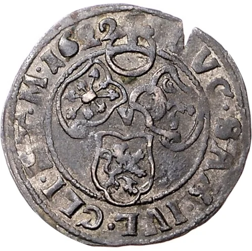 Three small shields, two over one, central 'V', small orb above, date in legend.