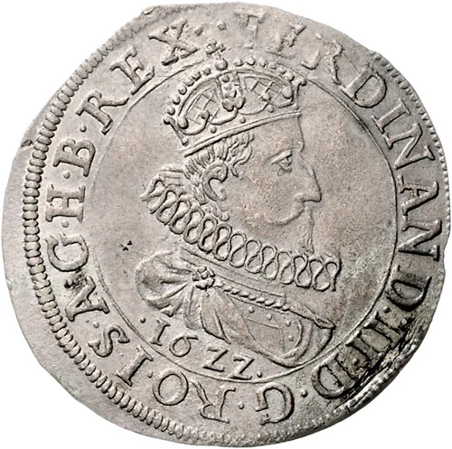Portrait in crown and ruffled collar, within inner circle, date beneath bust.