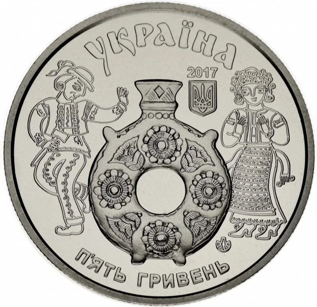 Description: The legend УКРАЇНА is above. Below it are the 2017 issue year and Ukraine's small coat of arms. The central design features a Kosiv-style ceramic vessel flanked by a boy and girl in national costume, with the semicircular face value П'ЯТЬ ГРИВЕНЬ beneath. The nickel silver coin bears the mint mark of the NBU Banknote Printing and Minting Works.