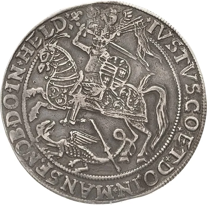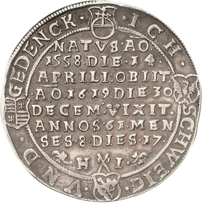 Description: Eight-line inscription with fleurons below, globus cruciger above. Surrounding coats of arms: Arnstein (right), Helderungen (bottom), Querfurt-Mansfeld (left).