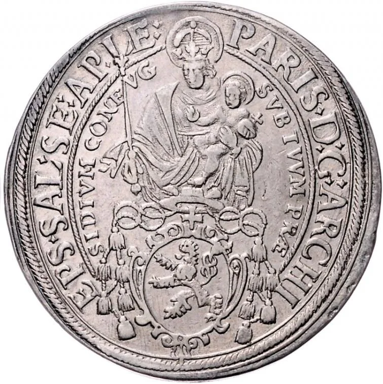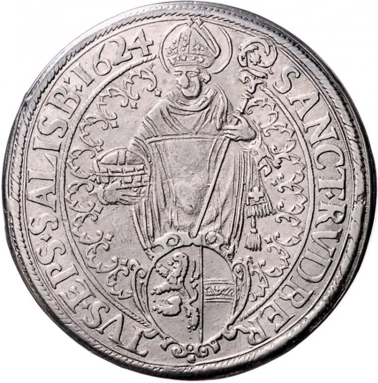 Saint Rupert holding a salt box and crozier, standing above Salzburg’s arms. Arabesques in field. Legend around, divided by the mitre.