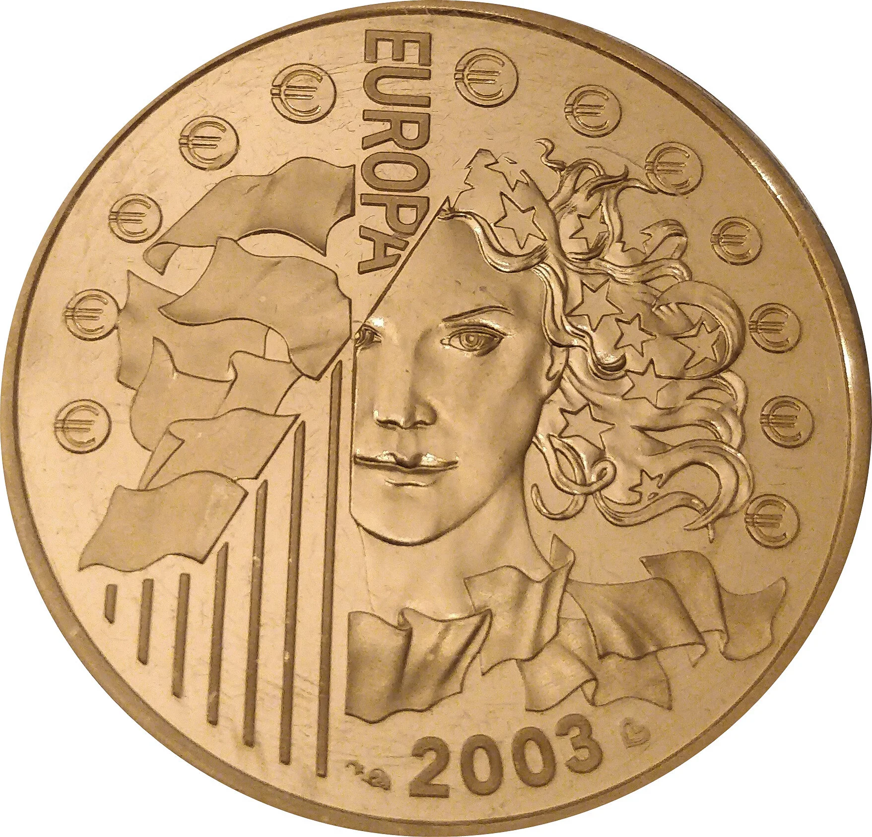 Inspired by Minoan octopus art, the design lists the twelve eurozone countries along curving tentacles. It features the three French coin sides, the initials "RF," the twelve European stars, and the face value "20 EURO," symbolizing French unity within European diversity.