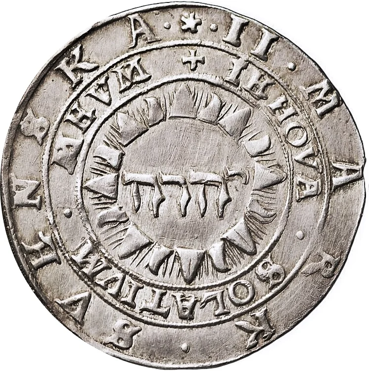 Sun with Hebrew "Jehovah" inside two circles, surrounded by the King's motto and the value in letters.