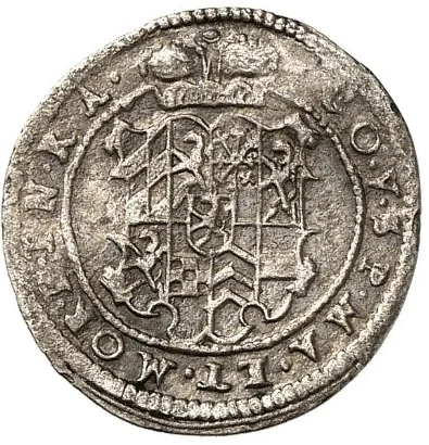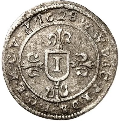 Lily cross in circle, central shield with 'I', date above, titles of Wolfgang Wilhelm.