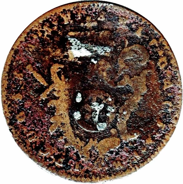 Arms with crown, sword, and crozier on a wheel, within baroque frame and legend.