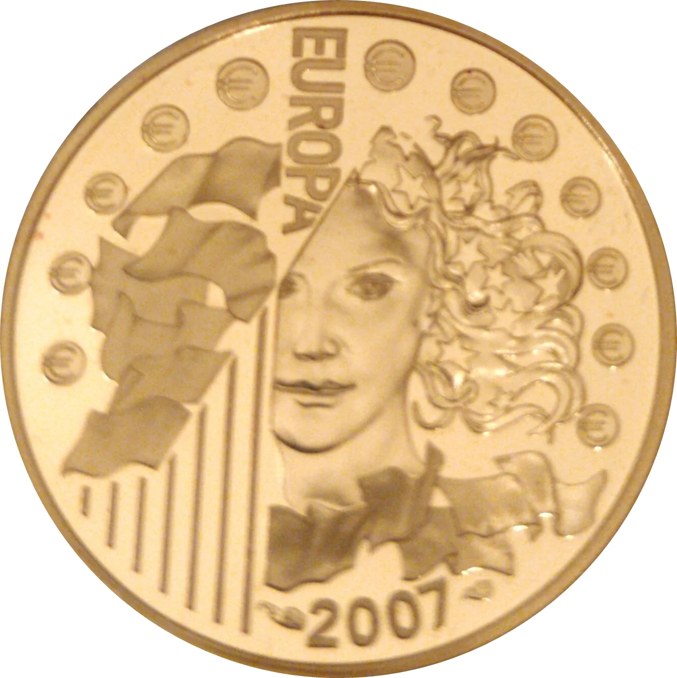 Portrait of Europa with stars in her hair, above an arc of 12 "€" symbols. To her left, European flags on mats.