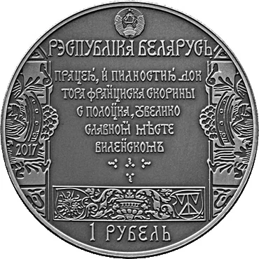 Description: Obverse: The State Emblem of the Republic of Belarus and the inscription "РЭСПУБЛІКА БЕЛАРУСЬ" at the top. The center features a quote from Skaryna's "Horologion," above a decorative element from his "Small Road Book." Flanking illustrations are fragments from the same book, with the issue year to the left. The bottom displays the value: "1 РУБЕЛЬ."