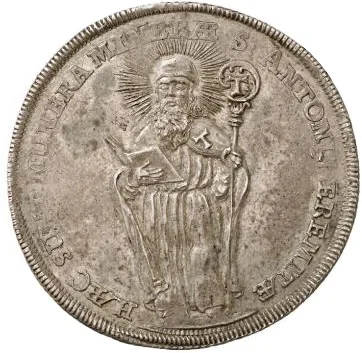 Saint facing left, holding bible and crozier. T on shoulder and crozier tip.
