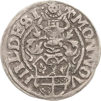 Arms with ornate helmet and maiden figure above, surrounded by legend.