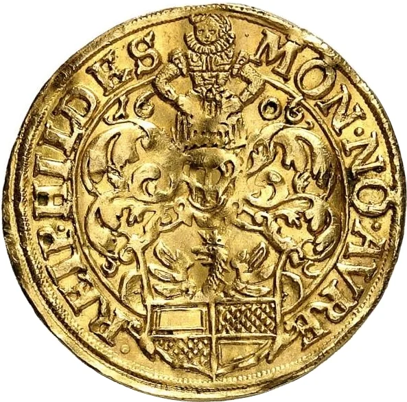 Imperial eagle with orb, crowned, bearing Rudolf II's titles.