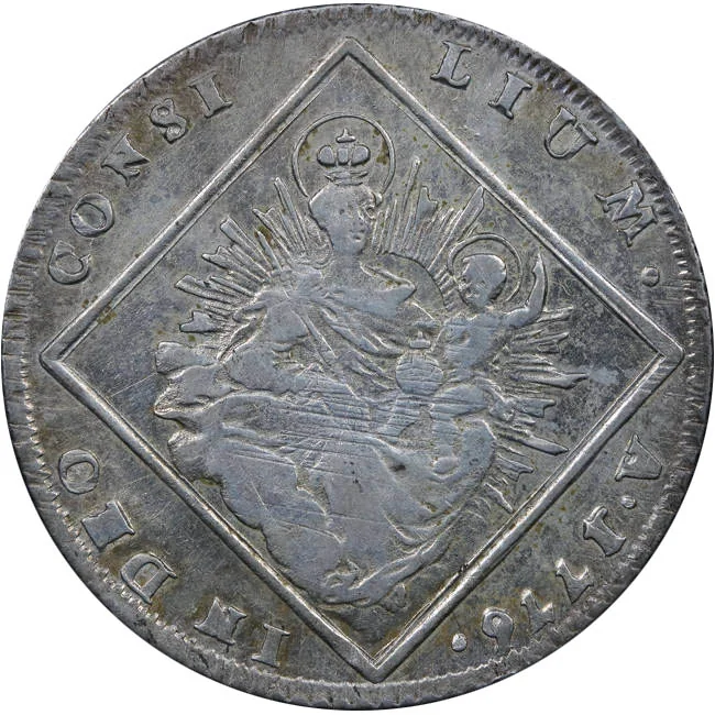 Madonna and Child in a rhombus, surrounded by clouds, sun, and rays.
