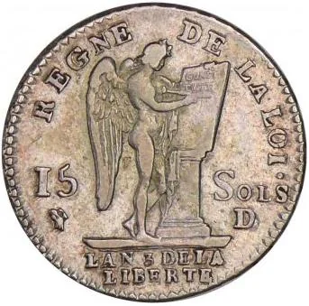 Genius engraving the Constitution on an altar, between "15" and "SOLS"; the number 15 and a workshop letter are below "SOLS."