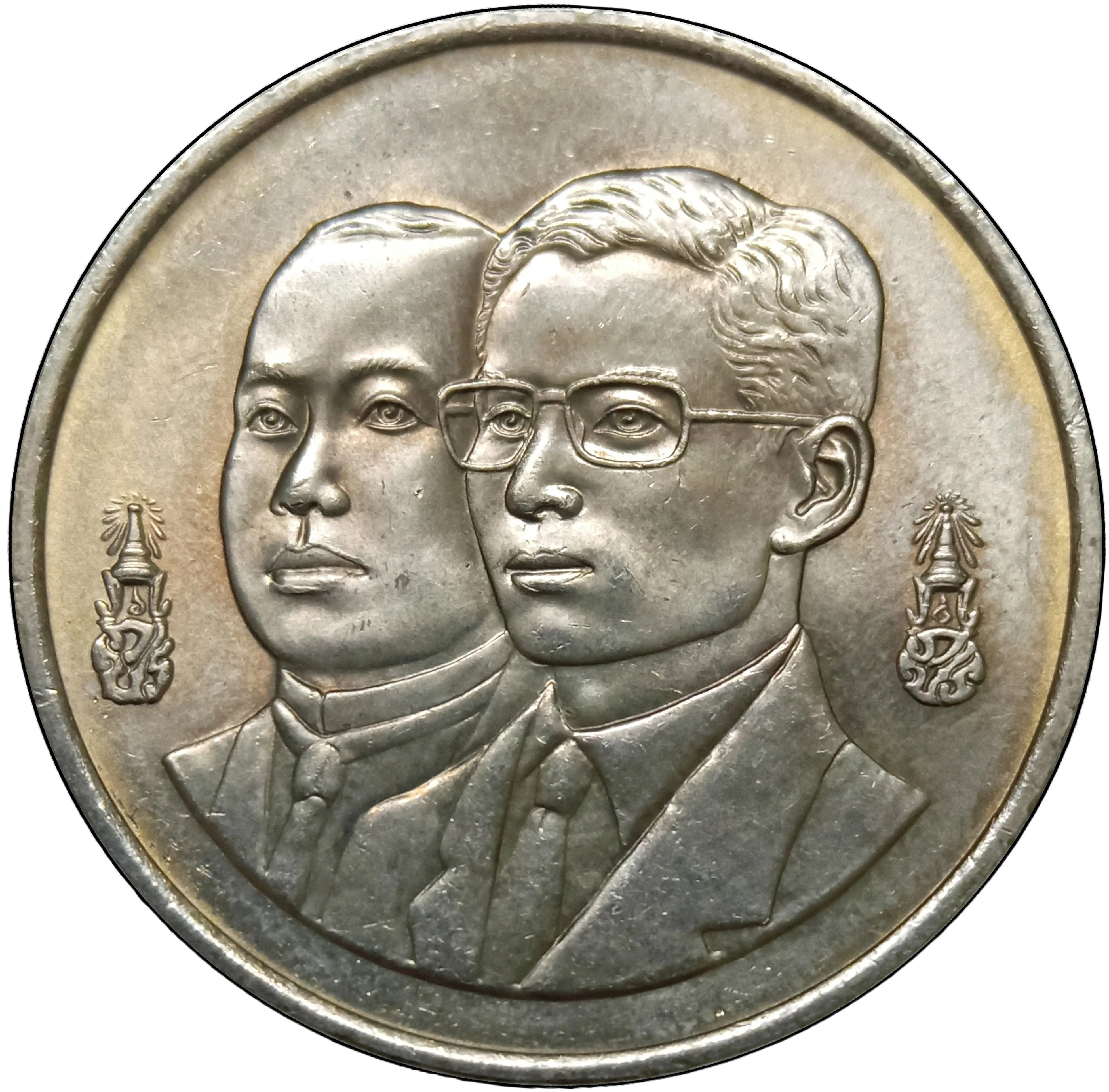 Conjoined busts of Kings Vajiravudh and Bhumibol Adulyadej, facing half-left, with their crowned monograms beside them.