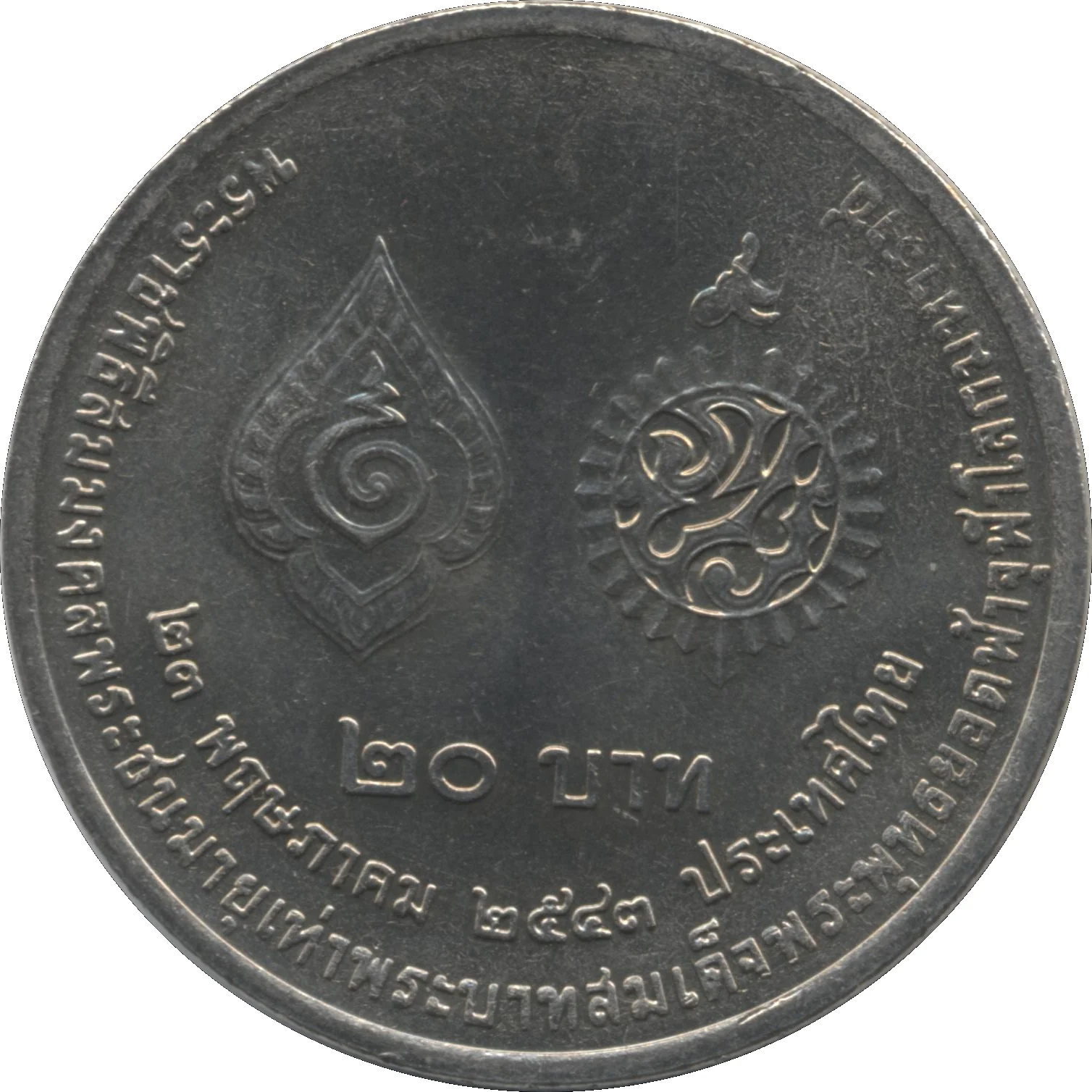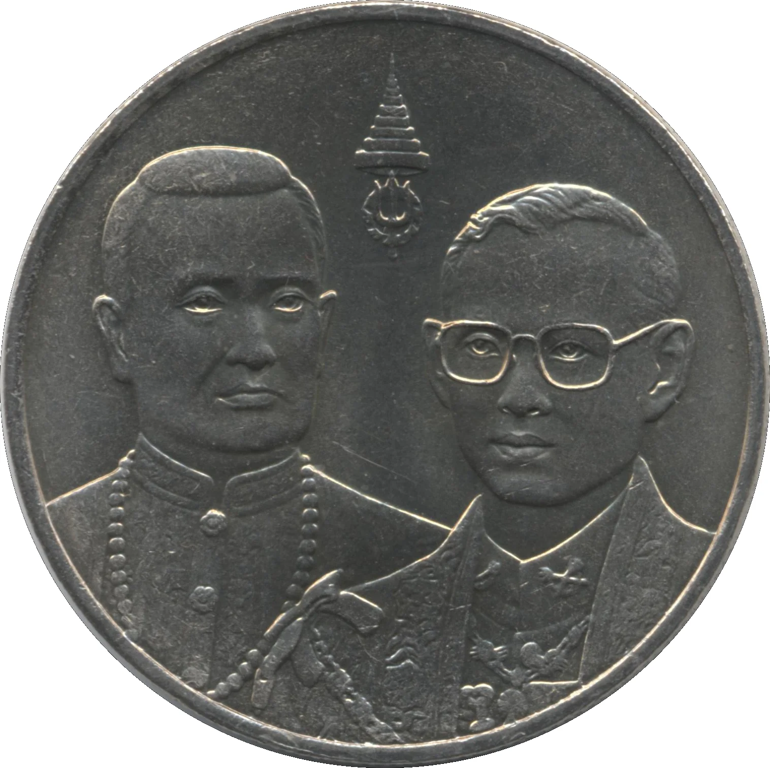 Conjoined busts of Kings Buddha Yodfa Chulaloke and Bhumibol Adulyadej, facing slightly inward. Below a nine-tiered umbrella is the Chakri dynasty emblem.