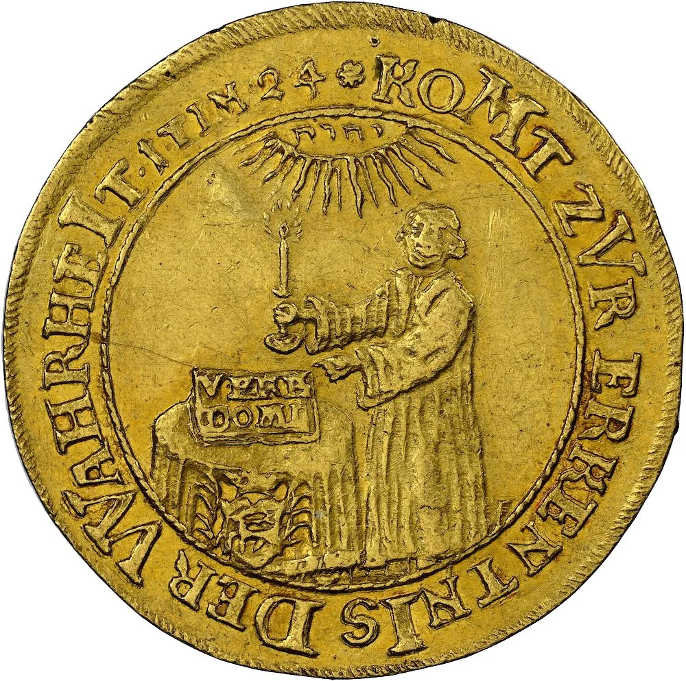 Martin Luther stands beside a table, holding a candlestick. An open Bible reads "VERB DOMI," and the tablecloth displays the Stolberg stag coat of arms.