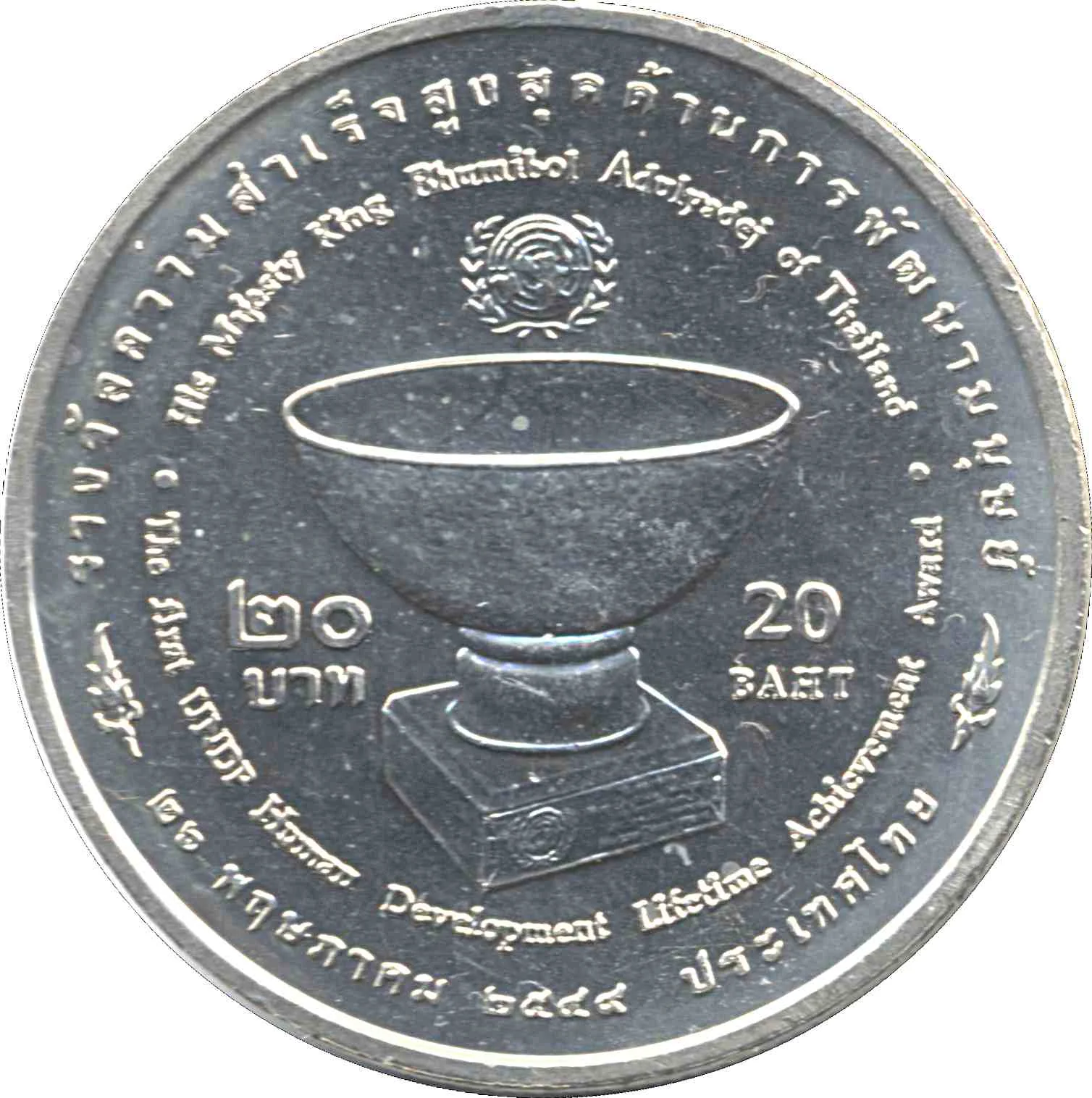 The bowl awarded to King Bhumibol Adulyadej by UN Secretary-General Kofi Annan beneath the UN emblem.