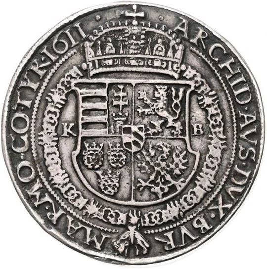 Crowned curved quartered shield (Árpád stripes, double cross, Bohemian lion, Dalmatian leopard heads, Moravian eagle) with an Austrian-Burgundian inescutcheon divides "KB" mintmark. Golden Fleece necklace inside inner circle, date in legend.