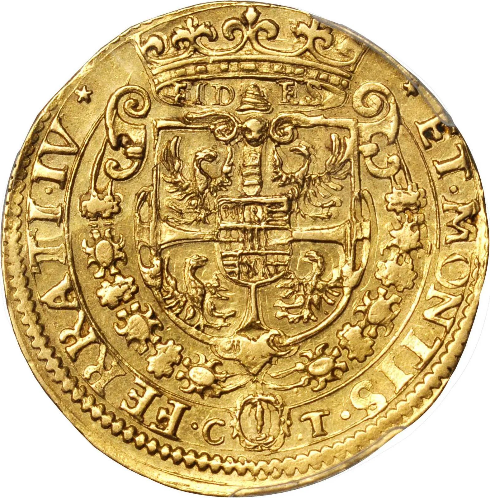 Arms with central nine-part shield, baroque frame, crown with "FID-ES" and Mt. Olympus, surrounded by the Order of the Redeemer.
