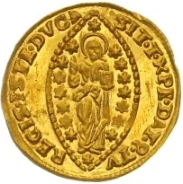 Saint Mark presents his cross-topped staff to a kneeling doge.