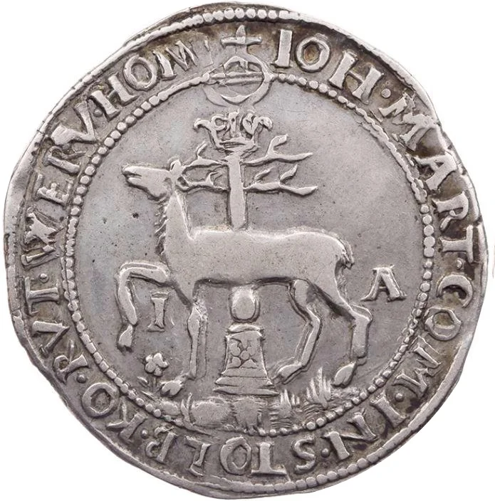 Stag left, column with crown, orb above, titles of Johann Martin I.