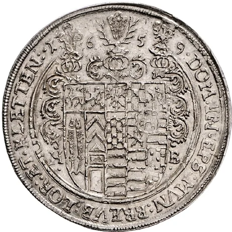 Arms flank mintmaster's initials, three helmets above, date in crests.