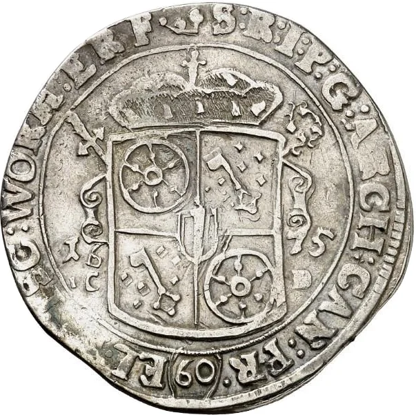 Crown above arms, no palms, arms flank date and initials.