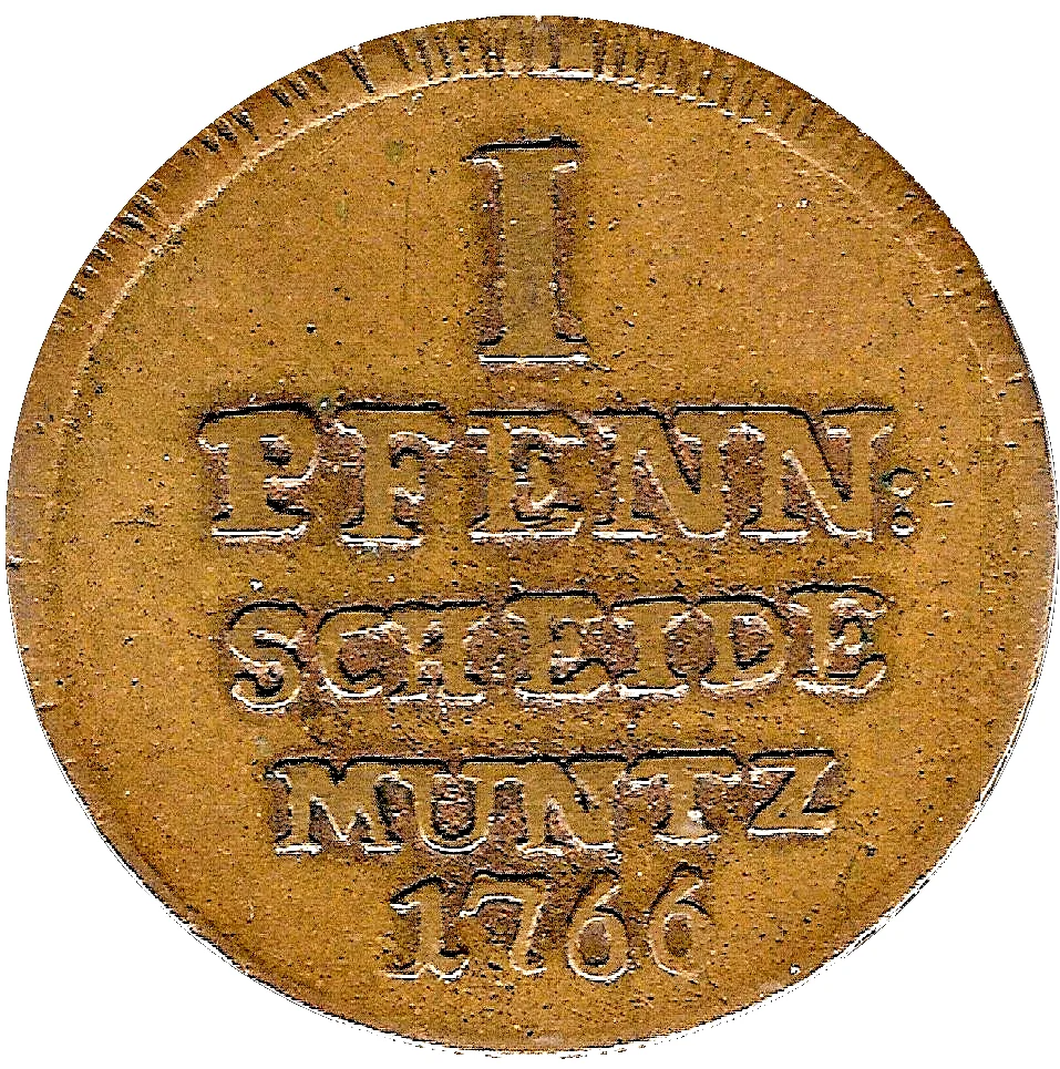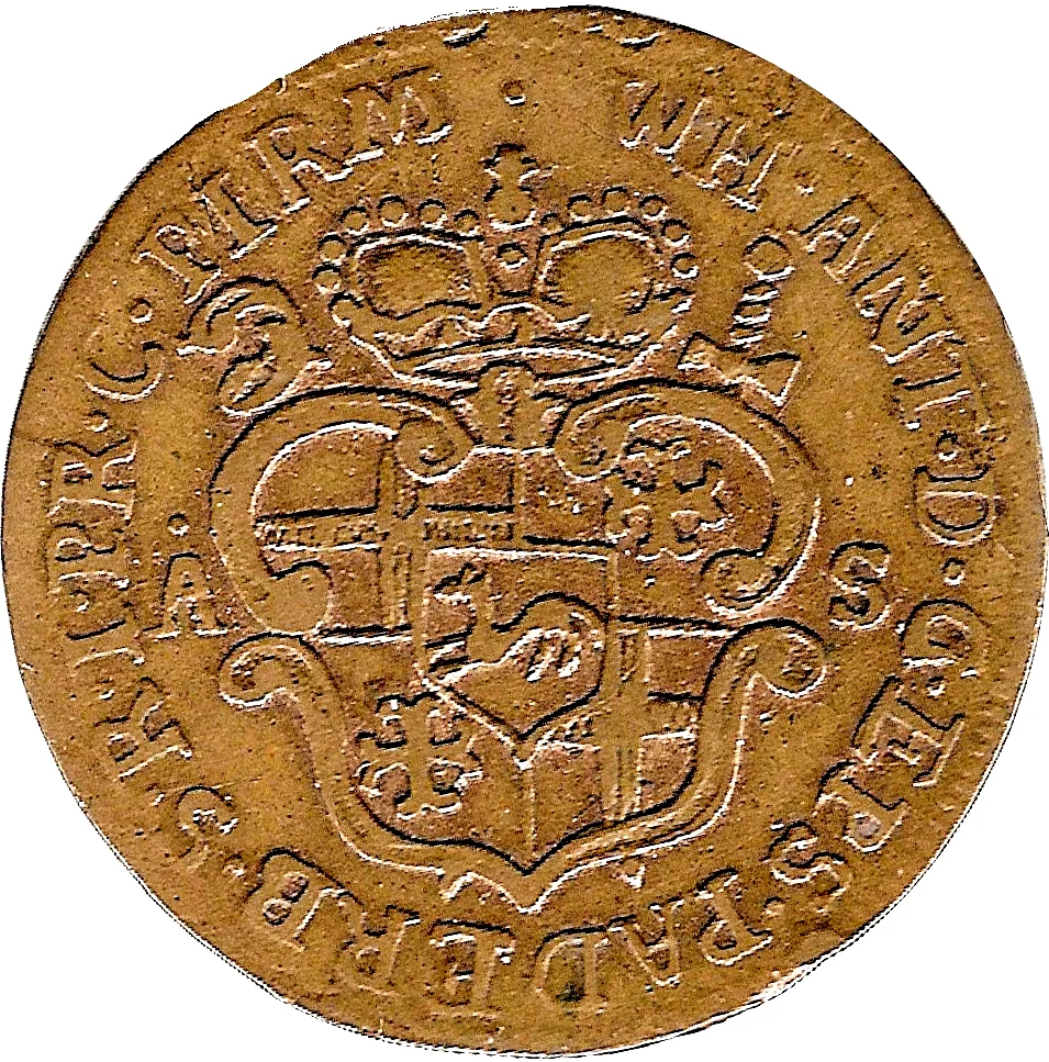 Shield of Paderborn and Pyrmont arms with Asseburg escutcheon, over crossed sword and crozier, flanked by mintmaster initials.