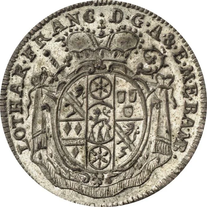 Crowned oval with six arms encircling a central Schonborn shield in a cartouche.
