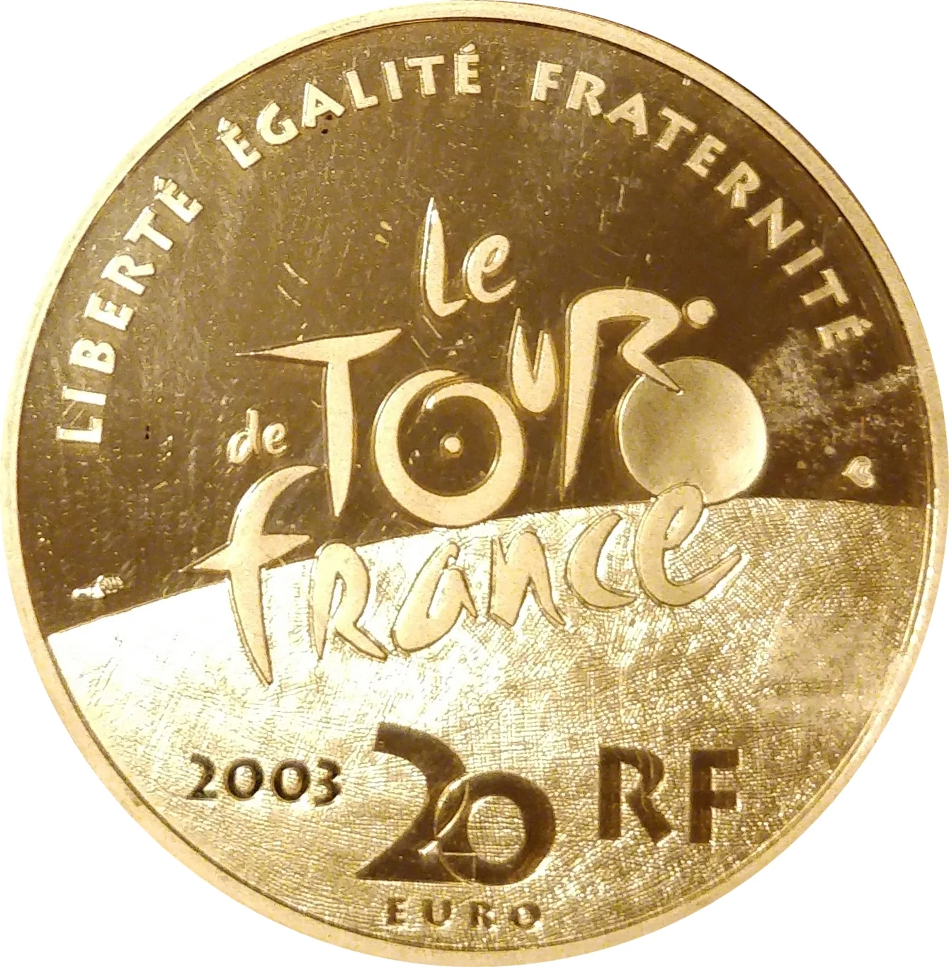 Stylized bicycle spelling "Le TOUR de fRance": the O is the back wheel, the U is the saddle, and the R forms the cyclist. The sun acts as the front wheel, all set upon a globe's arc.