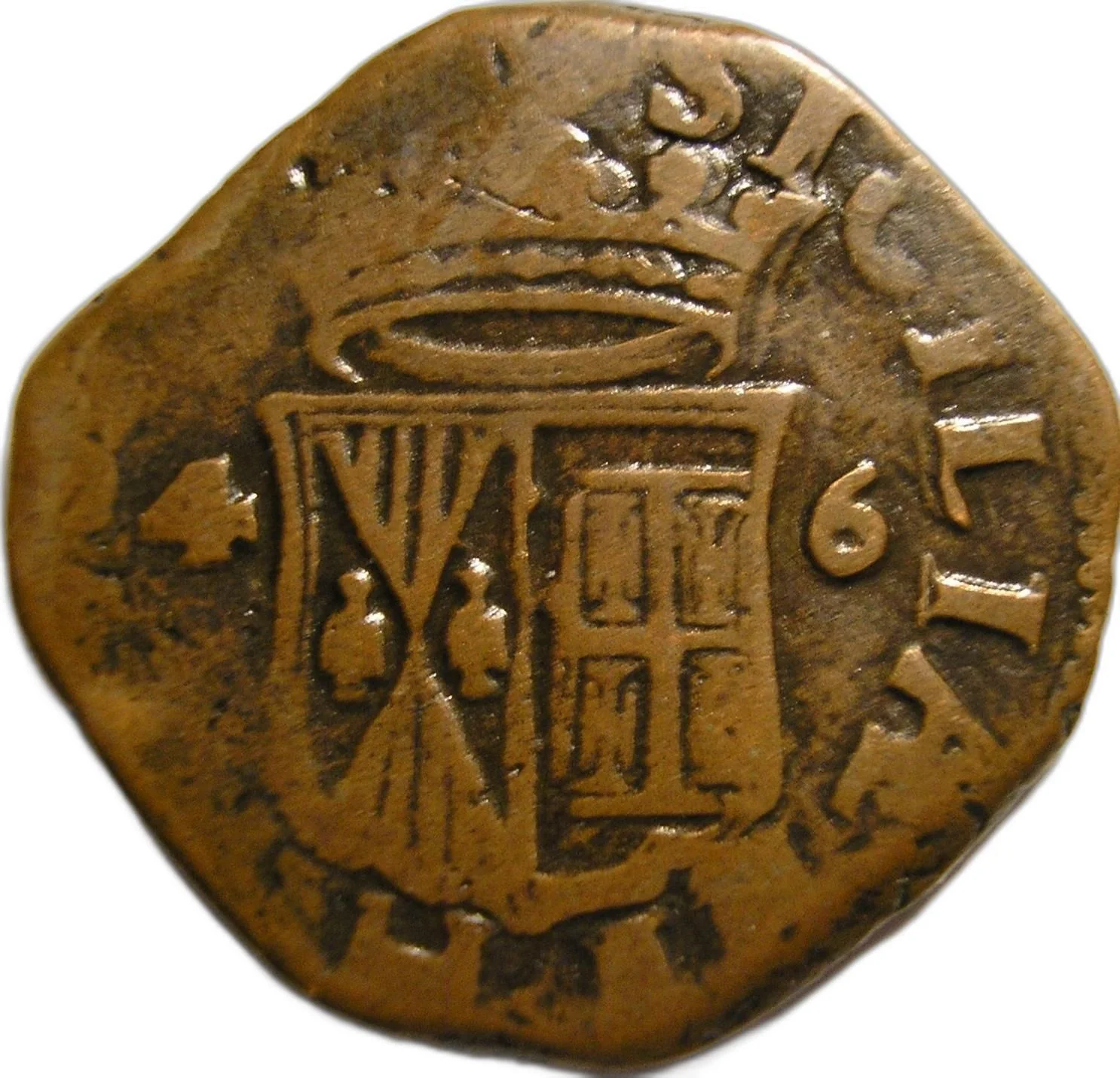 Crowned shield bearing the arms of Sicily and Jerusalem, flanked by the numbers 4 and 6.