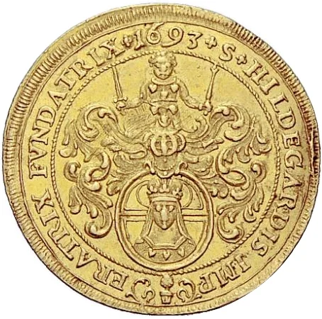 Bust of St. Hildegard in shield, helmet above with Genius holding sword and scepter, date in legend.