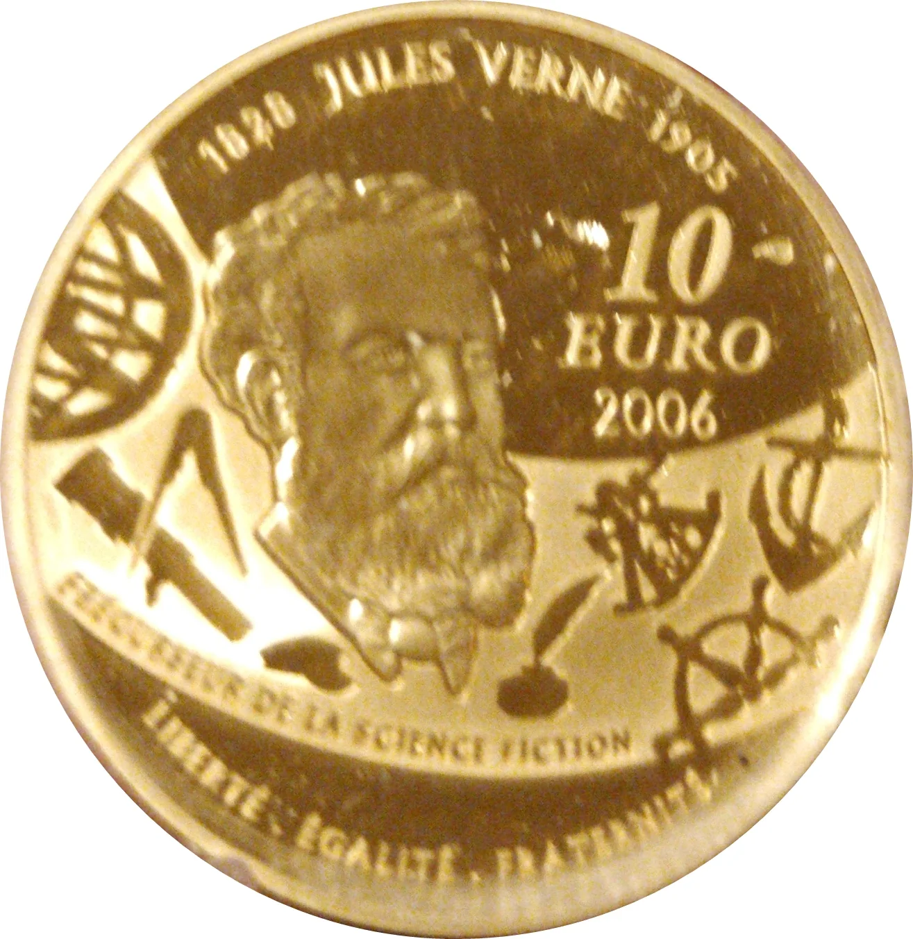 Jules Verne bust with anchor and instruments in a curved band.