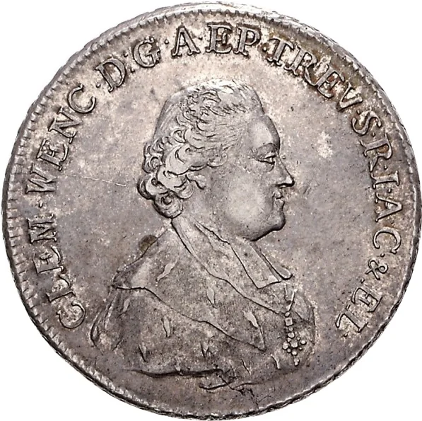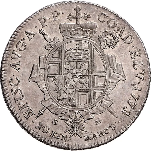 Arms with elector's cap above, crossed sword and crozier behind. Order cross below separating "GM." Legend encircles, denomination beneath.