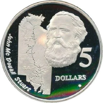 Bust of John McDouall Stuart with partial maps of the Northern Territory and South Australia, and the coin's value.