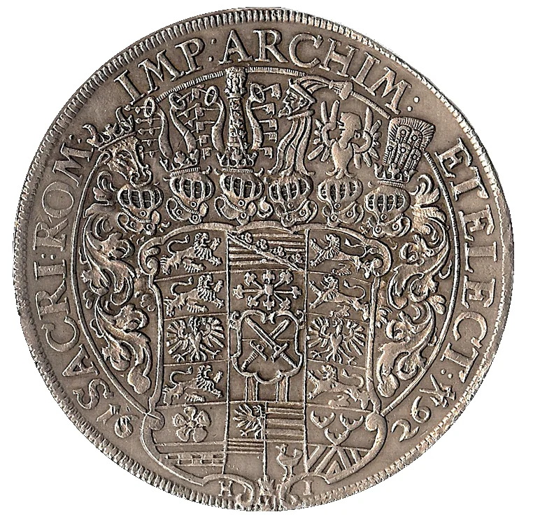 Coat of arms with six helms, eighteen fields, mint mark, and year.