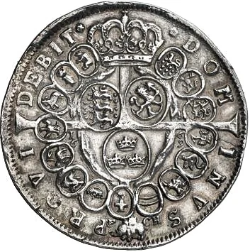 Central oval shields (Sweden, Denmark, Norway) under a Danish crown. A large cross overlays the design, its arms intersecting a band encircling the central shields and bearing the Order of the Elephant pendant. Fifteen provincial shields surround the band. The king's motto is on the rim, divided by the cross. The date is split vertically near the cross arms, between the band and provincial shields. Mintmarks flank the pendant.