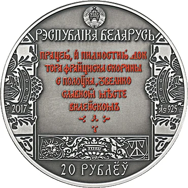 Description: Obverse: The State Emblem of Belarus and "РЭСПУБЛІКА БЕЛАРУСЬ" above. A red quote from Skaryna's "Horologion" epilogue is central, with a decorative element from the "Small Road Book" below. Flanking illustrations from the same book frame the minting year (left) and silver alloy standard (right). The denomination "20 РУБЛЁЎ" is at the bottom.