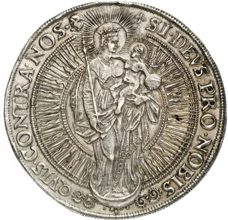 Madonna standing on a crescent, holding a sceptre, with the child holding an orb.