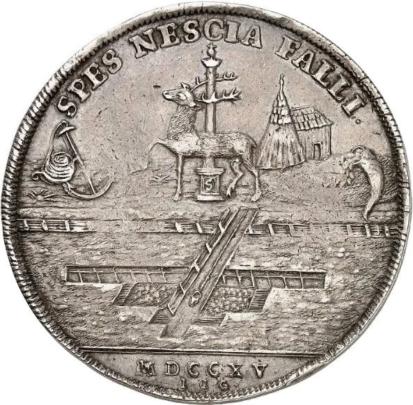 Stag over mining scene, Roman numeral date below.