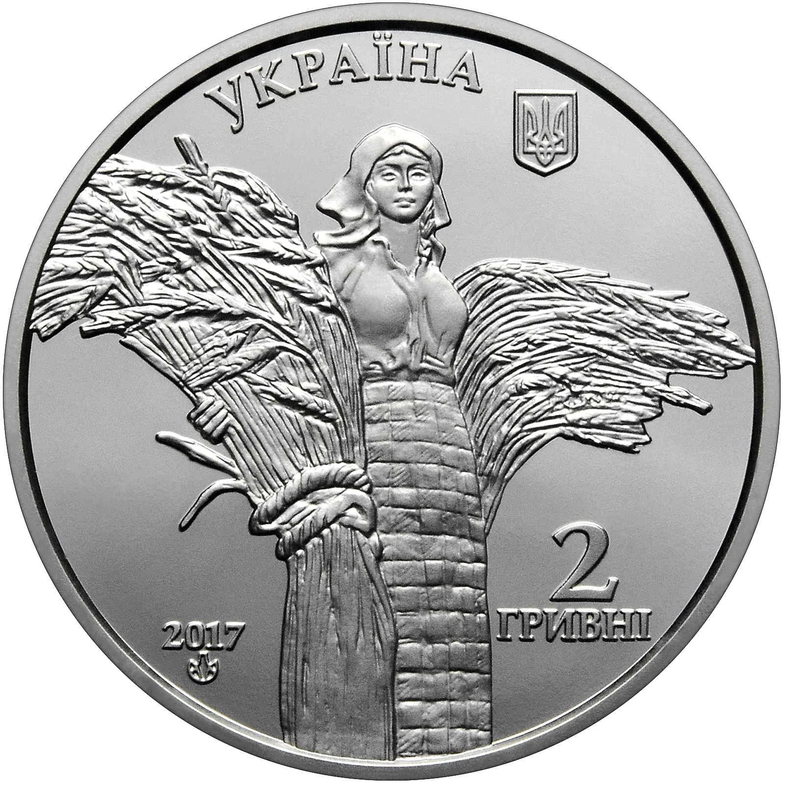 The obverse features Ukraine's coat of arms and name, a woman with wheat sheaves, the year 2017, the NBU mint mark, and the denomination 2 hryvnias.