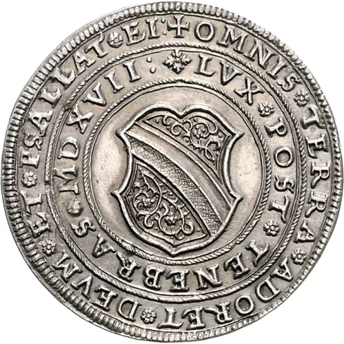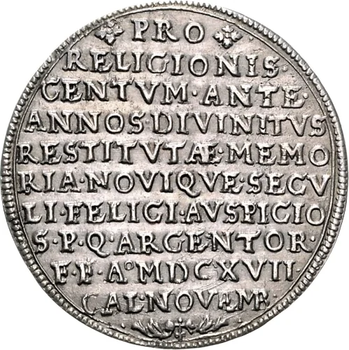 ❖PRO❖ / RELIGIONIS· / CENTVM·ANTE· / ANNOS·DIVINITVS / RESTITVTÆ·MEMO / RIA·NOVIQVE·SECV / LI·FELICI·AVSPICIO / S·P·Q·ARGENTOR· / F·F·A·MDCXVII· / CAL·NOVEMB·