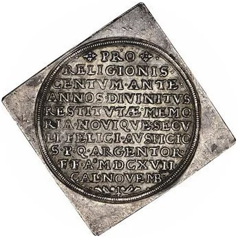 ❖PRO❖ / RELIGIONIS· / CENTVM·ANTE· / ANNOS·DIVINITVS / RESTITVTÆ·MEMO / RIA·NOVIQVE·SECV / LI·FELICI·AVSPICIO / S·P·Q·ARGENTOR· / F·F·A·MDCXVII· / CAL·NOVEMB·